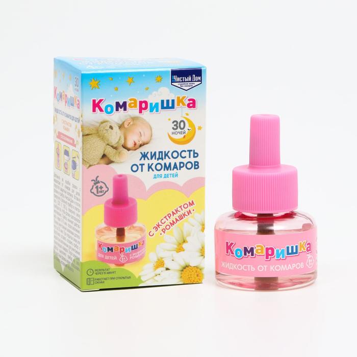 Флакон-жидкость от комаров ""Чистый дом"", комаришка, имеет удобный дозатор, который позволяет точно и экономно наносить средство в нужных местах комнаты. Достаточно нескольких капель на ночь, чтобы обеспечить защиту от комаров в течение 30 ночей.