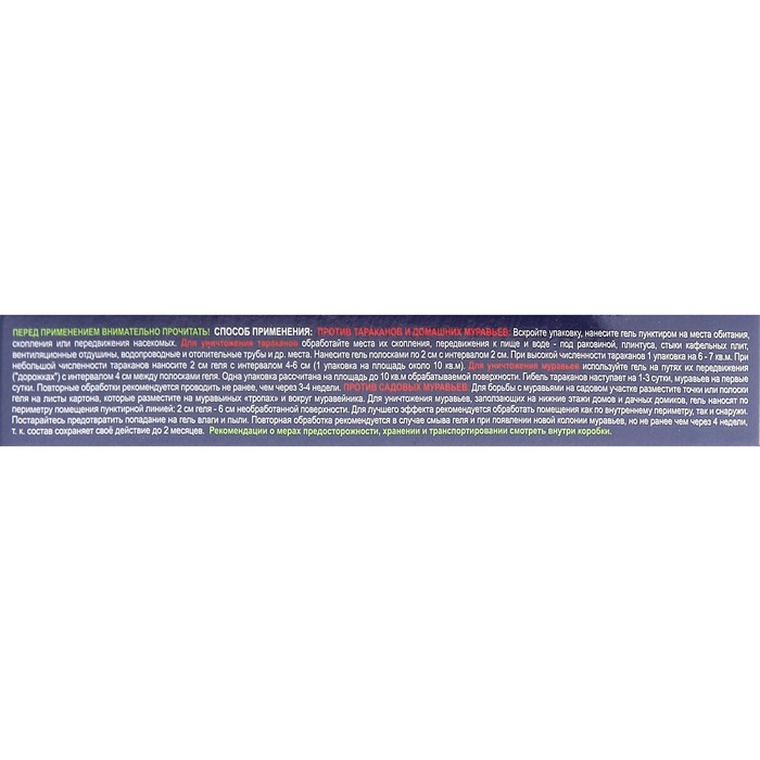 Способ применения: вскройте упаковку, нанесите гель пунктиром на места обитания, скопления или передвижения насекомых. Для уничтожения тараканов обработайте места их скопления, передвижения к пище и воде – под раковиной, плинтуса, стыки кафельных плит, вентиляционные отдушины, водопроводные и отопительные трубы и др. места. Нанесите гель полосками по 2 см с интервалом 2 см. При высокой численности тараканов 1 упаковка на 6 – 7 кв.м. При небольшой численности тараканов наносите 2 см геля с интервалом 4-6 см (1 упаковка на площадь около 10 кв.м). Для уничтожения муравьев используйте гель на путях их передвижения (“дорожках”) с интервалом 4 см между полосками геля. Одна упаковка рассчитана на площадь до 10 кв.м обрабатываемой поверхности. Гибель тараканов наступает на 1-3 сутки, муравьев на первые сутки. Повторные обработки рекомендуется проводить не ранее, чем через 3-4 недели.