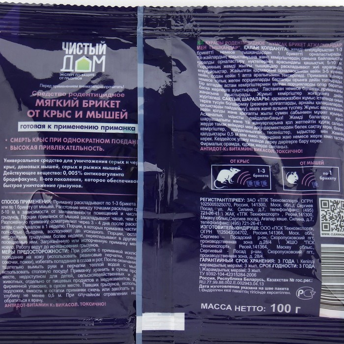 Тесто-брикет от крыс и мышей Чистый дом 100 г