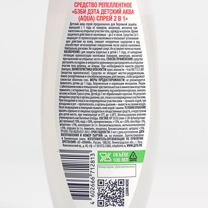Спрей репеллентный от комаров "БЭБИ ДЭТА" АКВА, детский, 2 в 1, с экстрактом алоэ вера, 100 мл 69101