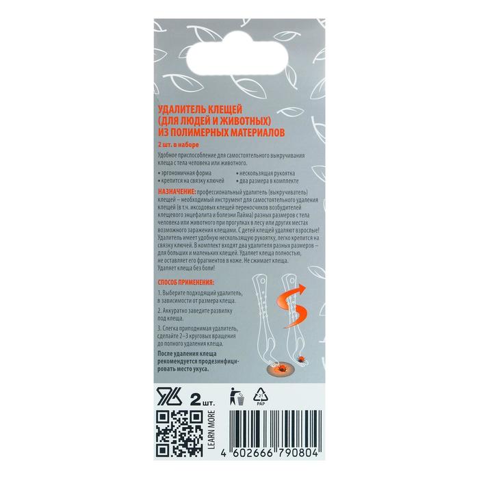 "Удалитель клещей для людей и животных ”ДЭТА” набор 2 шт предназначен для безопасного и эффективного удаления клещей с кожи людей и животных. Набор включает в себя два специальных инструмента, разработанных для удаления клещей различного размера без риска повреждения кожи.Инструменты изготовлены из высококачественных материалов, обеспечивающих долговечность и надежность при использовании. Их удобная конструкция позволяет быстро и безболезненно извлечь клеща, минимизируя риск передачи инфекций.Набор удалителей клещей ”ДЭТА” подходит как для использования дома, так и в походных условиях, обеспечивая надежную защиту от клещей в любой ситуации. Благодаря компактным размерам и легкому весу, эти инструменты удобно хранить и брать с собой в путешествия.Безопасное удаление клещей с кожи человека и животного является важной профилактической мерой против передачи различных заболеваний, поэтому набор удалителей клещей ”ДЭТА” станет незаменимым помощником для всех, кто заботится о здоровье своих близких и домашних питомцев.Необходимость защиты от клещей актуальна в любое время года, особенно в период активности клещей, поэтому наличие надежного инструмента для удаления клещей является неотъемлемой частью заботы о здоровье. Набор удалителей клещей ”ДЭТА” обеспечивает быстрое, безопасное и эффективное удаление клещей, делая процесс защиты от них максимально удобным и безопасным.Способ применения: Выберите подходящий удалитель, в зависимости от размера клеща. Аккуратно заведите развилку под клеща. Слегка приподнимая удалитель, сделайте 2-3 круговых вращения до полного удаления клеща.