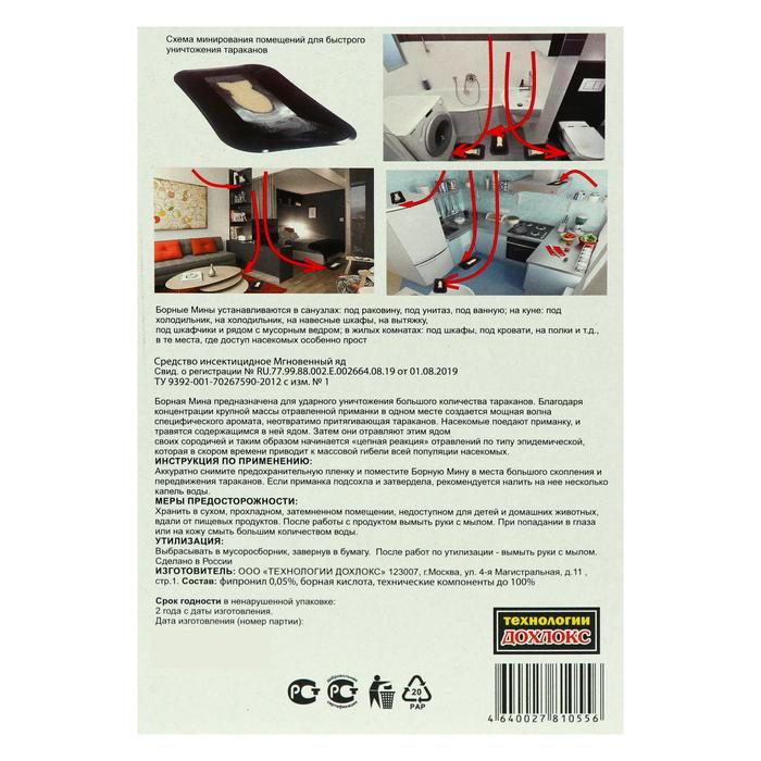 СОСТАВВ состав средства входнт: действующее вещевство фипронил (в пересчете на 100%) 0,05%, а также технологические добавки: консервант, гелеобразователь, кислота борная, кислота бензойная, пищевые аттраканты.ОПИСАНИЕБорная Мина предназначена для ударного уничтожения большого количества тараканов. Благодаря концентрации крупной массы отравленной приманки в одном месте создается мощная волна специфического аромата, неотвратимо притягивающая тараканов. Насекомые поедают приманку, и травятся содержащимся в ней ядом. Затем они отравляют этим ядом своих сородичей и таким образом начинается цепная реакция отравлений по типу эпидемической, которая в скором времени приводит к массовой гибели всей популяции насекомых.СПОСОБ ПРИМЕНЕНИЯАккуратно снимите предохранительную пленку и поместите Борную Мину в места большого скопления и передвижения тараканов. Если приманка подсохла и затвердела, рекомендуется налить на нее несколько капель воды.Борные Мины устанавливаются в санузлах: под раковину, под унитаз, под ванную; на куне: под холодильник, на холодильник, на навесные шкафы, на вытяжку, под шкафчики и рядом с мусорным ведром; в жилых комнатах: под шкафы, под кровати, на полки и т.д., в те места, где доступ насекомых особенно прост.
