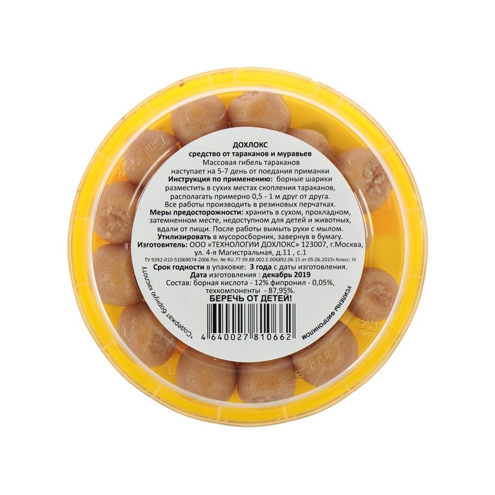 Дохлокс - средство от тараканов и муравьев. Массовая гибель тараканов наступает на 5-7 день от поедания приманки. Самый эффективный вариант – скатать небольшие ядовитые шарики. Тараканы собирают крошки еды, поэтому маленькие шарики с борной кислотой однозначно привлекут их внимание.Инструкция по применению: борные шарики разместить в сухих местах скопления тараканов, располагать примерно 0,5 - 1м друг от друга. Все работы производить в резиновых перчатках.Состав: борная кислота 12%, фипронил - 0,05%, техкомпоненты 87,95%.Меры предосторожности: хранить в сухом, прохладном, затемненном месте, недоступном для детей и животных, вдали от пищи. После работы вымыть руки с мылом. Утилизировать в мусоросборник, завернув в бумагу.