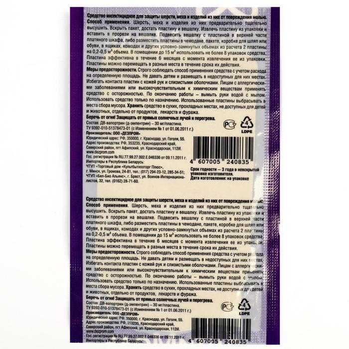 Средство инсектицидное для защиты шерсти, мкха и изделий из них от повреждения молью.Способ применения: Шерст, меха и изделия из них предварительно тщательно высушить. Вскрыть пакет, достать пластину и вешалку. Извлечь пластину из упаковки и вставить в прорези на вешалке. Подвесить вешалку с пластиной в верхней части шкафа, либо разместить пластины в чемодане, пакете, ящике для одежды из расчета 2 пластины на 0,2-0,5 м.куб. объема. В помещении до 15 м.кв. использовать не более 8 упаковок средства.Состав: ДВ - вапортрин,