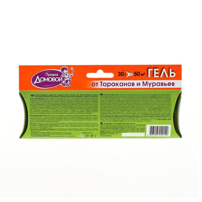 На природе и дома многие люди сталкиваются с клещами, клопами, москитами и другими опасными насекомыми, которые способны причинить массу вреда. Они переносят инфекцию, пьют вашу кровь и просто раздражают своим внешним видом. Вы устали бороться с ними? Гель от торговой марки «Домовой Прошка» защитит вас от тараканов и муравьёв (рыжих домовых, чёрных садовых).Способ применения: Для уничтожения тараканов перед обработкой проведите уборку помещения, плотно закройте водопроводные краны и ёмкости с водой, лишив насекомых источников влаги. Наносите гель тонким слоем и пунктирной линией в трещины, щели и другие труднодоступные места, которые могут служить для них укрытием.При малой и средней численности тараканов расход средства: 2 см геля на 4 см обрабатываемой поверхности; при большой численности 2 см геля на 2 см поверхности. Полная гибель тараканов наступает на вторые сутки. Повторные обработки следует проводить не ранее, чем через 4 недели.Для уничтожения муравьёв наносите гель пунктиром в местах обнаружения или передвижения насекомых с интервалом в 2 см между полосками. Полная гибель вредителей наступает на 2‒3 сутки. Остаточное действие сохраняется 1,5‒2 месяца. В состав средства также входят: гелеобразователь 1%, вода 10%, битрекс 0,01%, консервант 0,2% и пищевые аттрактанты до 100%.