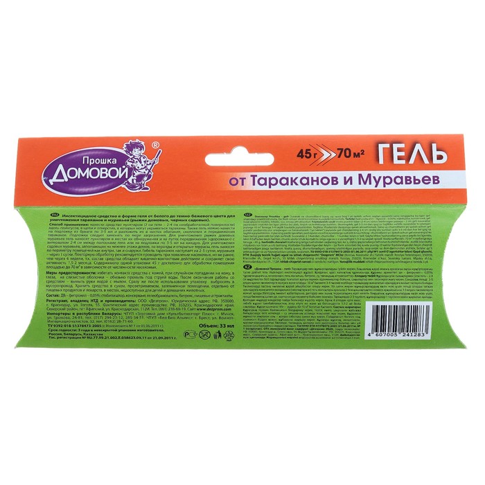 На природе и дома многие люди сталкиваются с клещами, клопами, москитами и другими опасными насекомыми, которые способны причинить массу вреда. Они переносят инфекцию, пьют вашу кровь и просто раздражают своим внешним видом. Вы устали бороться с ними? Гель от торговой марки «Домовой Прошка» защитит вас от тараканов и муравьёв (рыжих домовых, чёрных садовых).Способ применения: Для уничтожения тараканов перед обработкой проведите уборку помещения, плотно закройте водопроводные краны и ёмкости с водой, лишив насекомых источников влаги. Наносите гель тонким слоем и пунктирной линией в трещины, щели и другие труднодоступные места, которые могут служить для них укрытием.При малой и средней численности тараканов расход средства: 2 см геля на 4 см обрабатываемой поверхности; при большой численности 2 см геля на 2 см поверхности. Полная гибель тараканов наступает на вторые сутки. Повторные обработки следует проводить не ранее, чем через 4 недели.Для уничтожения муравьёв наносите гель пунктиром в местах обнаружения или передвижения насекомых с интервалом в 2 см между полосками. Полная гибель вредителей наступает на 2‒3 сутки. Остаточное действие сохраняется 1,5‒2 месяца. В состав средства также входят: гелеобразователь 1%, вода 10%, битрекс 0,01%, консервант 0,2% и пищевые аттрактанты до 100%.