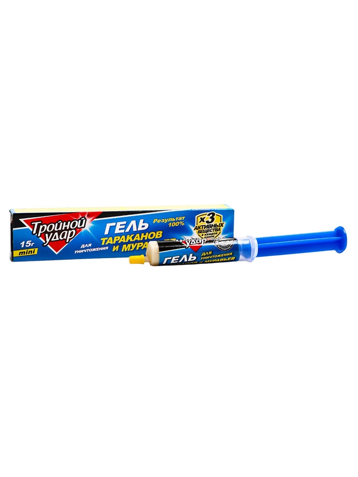 Средство предназначено для уничтожения тараканов и муравьев (рыжих домовых, черных садовых). СОСТАВДействующее вещества - циперметрин 0,1% из группы пиретроидов, имидаклорпид 0,1 представитель неоникотиноидов и фосфоро-органическое соединение диазинон 0,3%. В состав средства также входят: гелеобразователь 1%, вода 10%, битрекс 0,01%, консервант 0,2% и пищевые аттрактанты до 100%.СПОСОБ ПРИМЕНЕНИЯДля уничтожения тараканов перед обработкой проведите уборку помещения, плотно закройте водопроводные краны и ёмкости с водой, лишив насекомых источников влаги. Наносите гель пунктирной линией вдоль плинтусов, в щели и отверстия, в которых могут укрываться тараканы.При малой и средней численности тараканов расход средства: 2 см геля на 4-6 см обрабатываемой поверхности; при большой численности 2 см геля на 2 см поверхности. Гель можно нанести полосками или каплями на небольшие листочки бумаги и разложить их в местах обитания насекомых. Полная гибель тараканов наступает на вторые сутки.Для уничтожения муравьёв нанесите гель пунктиром в местах обнаружения или передвижения насекомых с интервалом в 2-4 см между полосками. Полная гибель наступает на 2‒3 сутки.Повторную обработку следует проводить не ранее, чем через 4 недели. Остаточное действие сохраняется 1,5‒2 месяца.