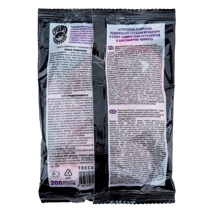 Способ применения: поместить средство в специально предназначенные емкости для раскладки отравленных приманок по 1-2 брикета от мышей и 3-4 брикета от крыс. Размещение в специальных емкостях повышает поедаемость средства, препятствуя его растаскиванию грызунами. Расстояние между точками раскладки 2-15 м в зависимости от захламленности помещений и численности грызунов. Места раскладки приманки осматривают через 1-2 дня, восполняя ее по мере поедания. Работу проводят до исчезновения грызунов.