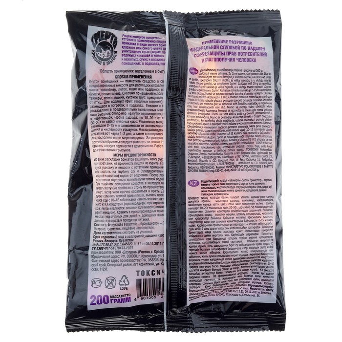 Способ применения: поместить средство в специально предназначенные емкости для раскладки отравленных приманок по 1-2 брикета от мышей и 3-4 брикета от крыс. Размещение в специальных емкостях повышает поедаемость средства, препятствуя его растаскиванию грызунами. Расстояние между точками раскладки 2-15 м в зависимости от захламленности помещений и численности грызунов. Места раскладки приманки осматривают через 1-2 дня, восполняя ее по мере поедания. Работу проводят до исчезновения грызунов.