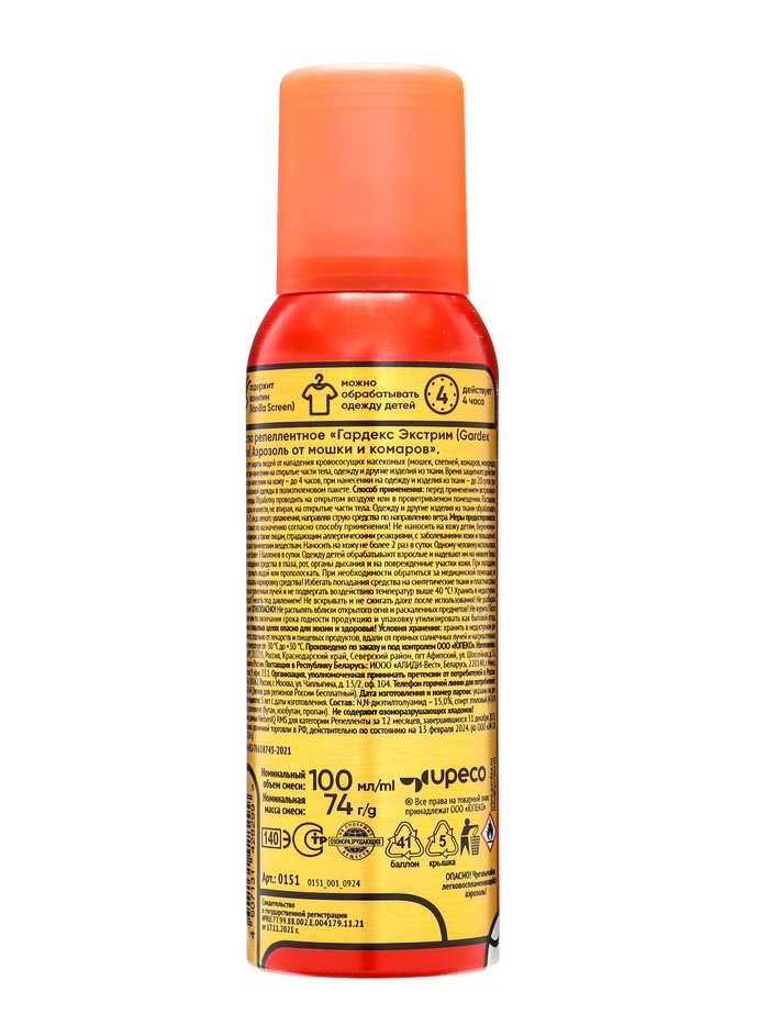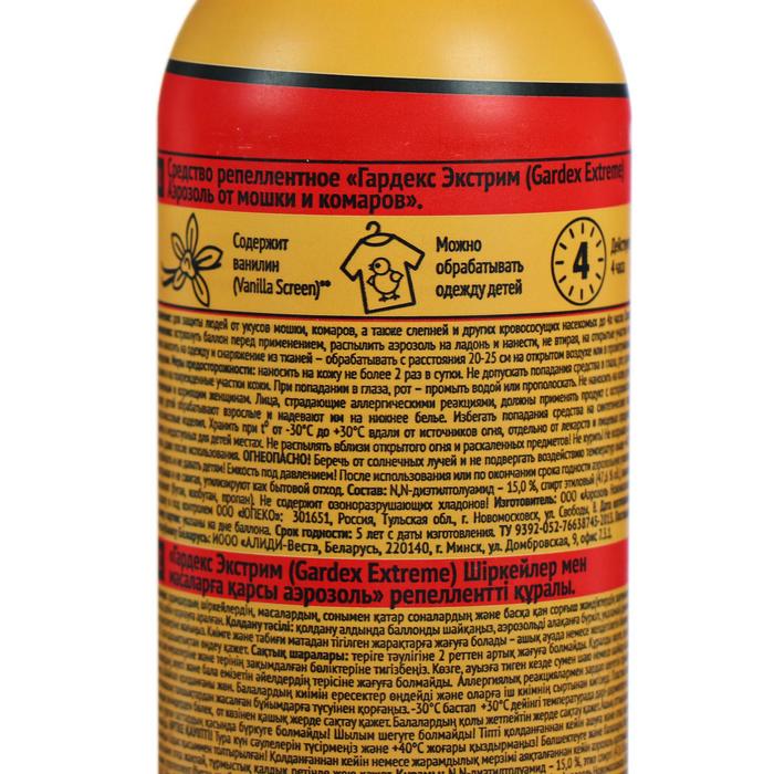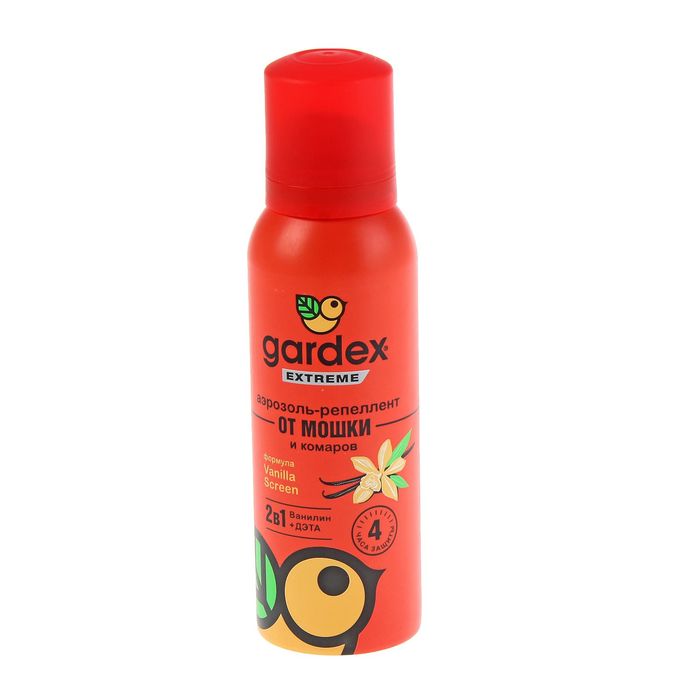 Аэрозоль репеллентный "Gardeх Eхtreme", 2 в 1, от комаров и мошек, 100 млАэрозоль от торговой марки Gardeх обеспечит надёжную защиту от укусов мошек, комаров, слепней, мокрецов и москитов.Распыляйте средство на открытые участки кожи, одежду и снаряжение из натуральных тканей.Состав: диэтилтолуамид, спирт этиловый, ванилин, бутан, изобутан, пропан.Особенности препарата:* содержит ванилин — эффективное вещество против мошек;* действует в течение 15 дней.