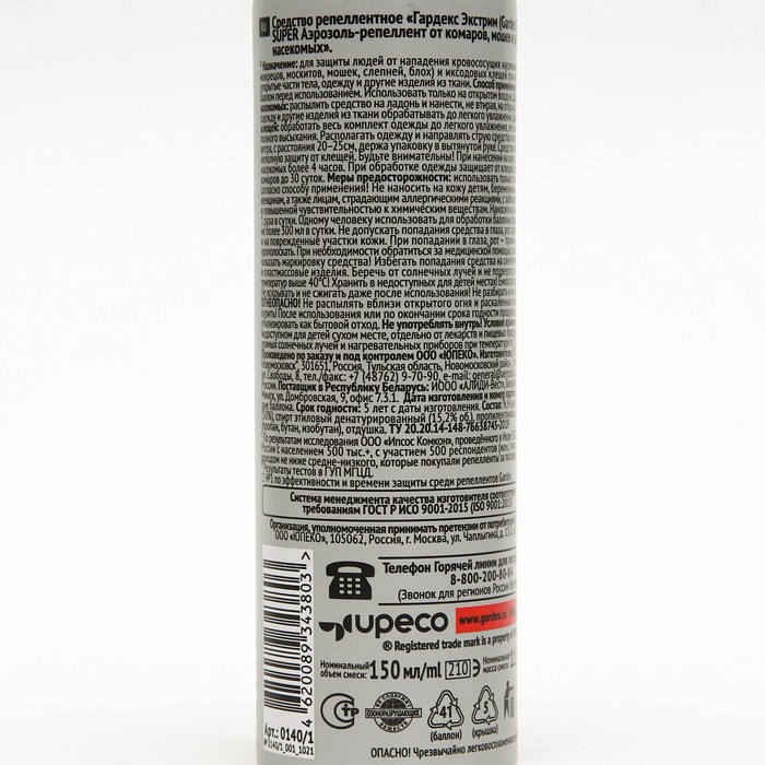 Средство безопасно, его можно наносить на кожу или одежду и снаряжение из натуральных тканей. Аэрозоль от комаров и других летающих насекомых активен более 8 часов при применении на кожу, и до 30 суток при нанесении на одежду. Защита от клещей действует до 5 суток только при обработке одежды и при желании может быть усилена средством от клещей Gardex Extreme.