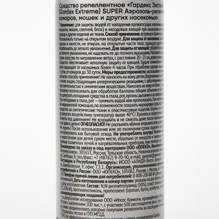 Состав: N,N-диэтилтолуамид (50%), спирт этиловый денатурированный (15,7% об.), пропиленгликоль, пропеллент (пропан, бутан, изобутан), отдушка