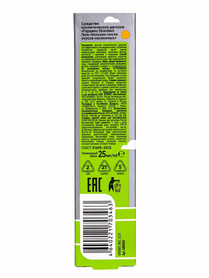 Гель создаёт защитный слой на месте укуса, успокаивая воспалённую кожу. Его можно наносить сразу после укуса или при первых признаках раздражения — эффект ощущается уже через несколько минут.