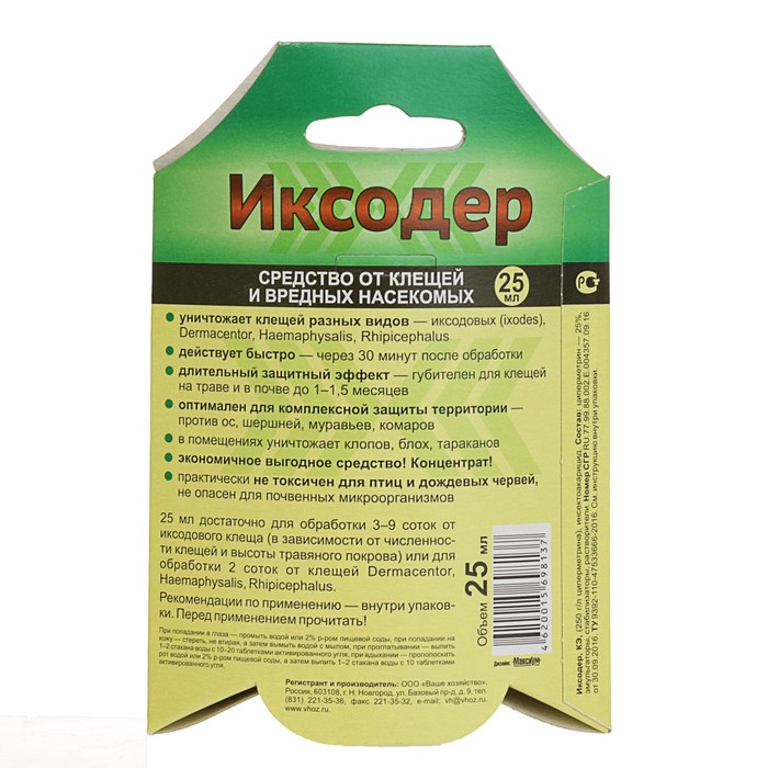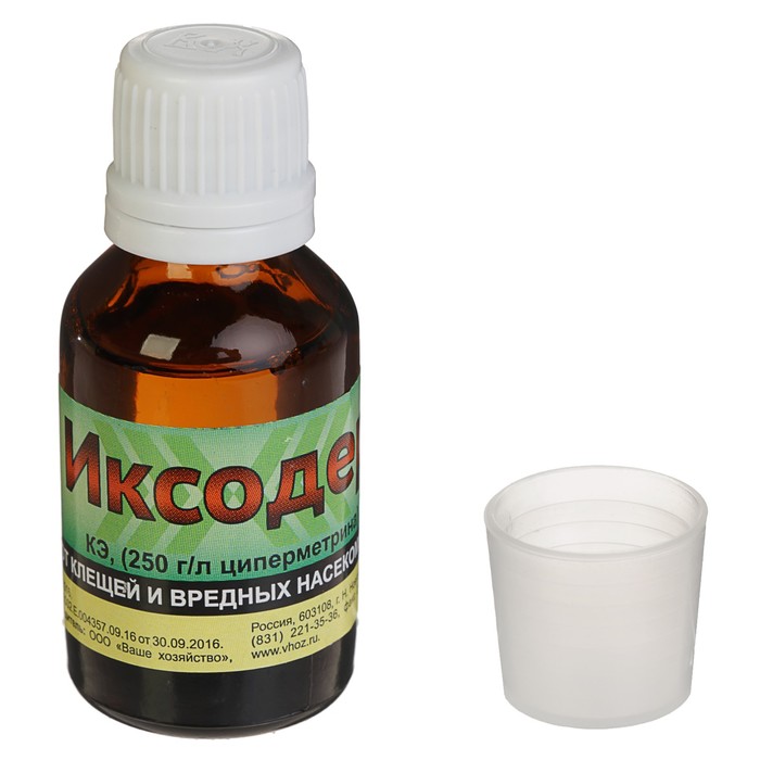«Иксодер» оптимален для комплексной защиты территории против клещей, а также ос, шершней, муравьев… При этом практически не токсичен для птиц и дождевых червей, почвенных микроорганизмов. Обработку проводят путем опрыскивания или с помощью генератора аэрозольного тумана.