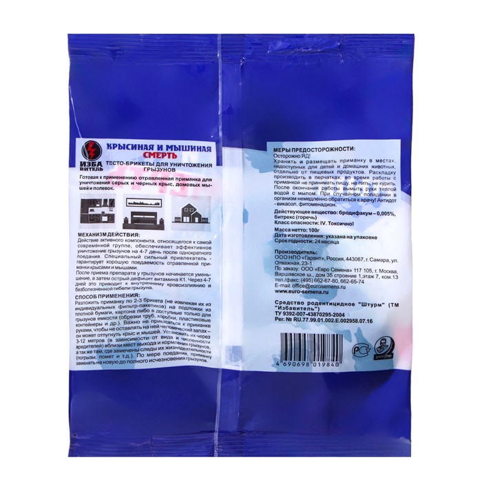 Готовая пищевая отравленная приманка с мумифицирующим эффектом для уничтожения серых и черных крыс, домовых мышей, полевок и других мышевидных грызунов для применения населением в быту.