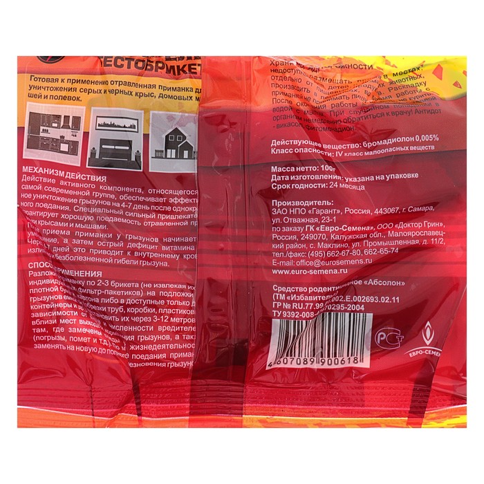 Готовая пищевая отравленная приманка для уничтожения серых и черных крыс, домовых мышей, полевок и других мышевидных грызунов для применения населением в быту.