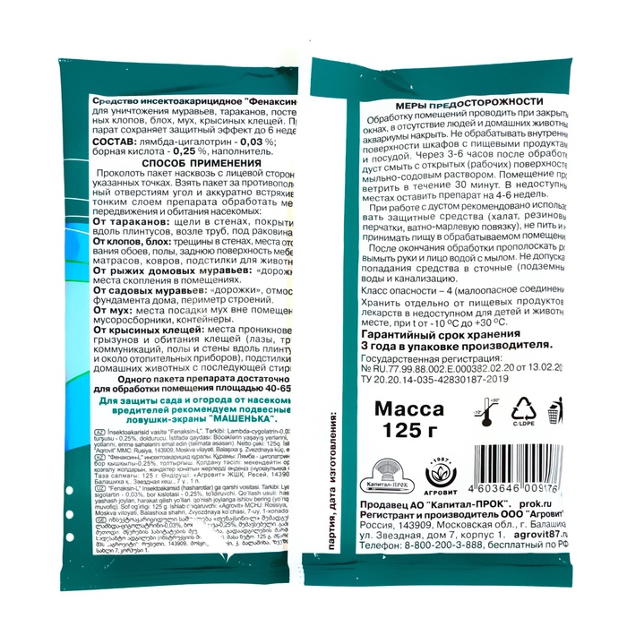 Инсектоакарицидное средство Фенаксин L представляет собой дуст в виде порошка от белого до серого цвета, полностью готовый к применению. Два активных действующих вещества обеспечивают острую инсектоакарицидную активность препарата против насекомых и последующий защитный эффект в течение 6 недель, подходит для уничтожения бытовых насекомыхСОСТАВДействующими веществами его являются: пиретроид лямбда-цигалотрин - 0,03% и представитель неорганических кислот - борная кислота - 0,25%. В его состав входит также масло растительное или минеральное, предотвращающее пыление и наполнители тальк или каолин.СПОСОБ ПРИМЕНЕНИЯ Тараканы: Для борьбы с тараканами дуст используют в местах обитания, скопления, возможного обитания или на путях их проникновения в помещения. Обработку проводят, .нанося дуст тонким слоем, в отверстия и щели в стенах, дверных коробках, порогах, щели вдоль плинтусов, облицовочных покрытий, в места разрушений на вводе и выводе труб водопроводной, отопительной и канализационной систем, под раковинами. Обработку проводят одновременно во всех помещениях, где обнаружены тараканы. При большой численности насекомых обрабатывают и смежные помещения в целях предотвращения заселения их тараканами. Норма расхода: упаковка 100г рассчитана на выборочную обработку помещения площадью 30-50 м2.Муравьи: Для уничтожения рыжих домовых муравьев в помещении следует обработать пути их передвижения ('дорожки) или места скопления в душевых,. котельных, санузлах, складах, базах. При появлении рабочих муравьев обработку следует повторить. Для уничтожения различных видов садовых, которые заползают внутрь помещений, следует нанести дуст тонким слоем на отмостку фундамента дома, по периметру крыльца, террасы или веранды, т.е. на путях проникновения муравьев в помещения.Постельные клопы: Дуст равномерно наносят на места обитания клопов. Скопления насекомых выявляют предварительно перед обработкой. Тонким слоем средство наносят на участки стен, где есть трещины, в щели, за плинтусами, а также на заднюю поверхность мебели, обратную сторону ковров и деревянные стыки кровати. Постельные принадлежности не обрабатывать. Повторные обработки проводят при появлении клопов.Блохи: Для уничтожения блох в помещениях обрабатывают плинтусы, поверхность пола (особенно в. местах отставания линолеума и плинтусов), щели за плинтусами, ковры, дорожки с обратной стороны. При наличии в доме животных (кошки, собаки). обрабатывают места их отдыха: нижнюю сторону подстилок и ковриков, которые через 3 суток вытряхивают, а затем стирают перед последующим использованием. В захламленных подвалах (если очистка их затруднена), то можно увеличить вдвое.Мухи: Средство используют для обработки мест посадки мух на открытом воздухе, обрабатывая. мусоросборники, контейнеры, а также допускается обработка мусорокамер в подвалах. Повторные обработки проводят по энтомологическим показаниям - появлении: окрыленных мух или обнаружении личинок или куколок мух в мусорокамерах и мусоросборниках, чтобы предотвратить вылет имаго.Крысиные клещи: Для уничтожения крысиных клещей обрабатывают, в первую очередь, места проникновения грызунов в помещения и пути их перемещения: лазы, трубы различных коммуникаций, плинтусы, стены и полы вдоль них. Затем места возможной концентрации клеще