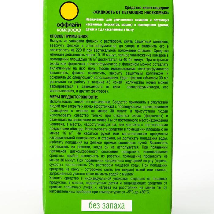 Назначение: для уничтожения комаров и других летающих кровососущих насекомых (москитов, мошек) в помещениях населением в быту, в том числе в присутствии детей.Способы применения: вынуть из упаковки флакон с раствором, снять защитный колпачок, ввернуть флакон в электрофумигатор до упора и включить его в электросеть на 220 В при вертикальном положении флакона. Полное уничтожение насекомых достигается менее чем через 1 час. При открытых окнах (форточках) электрофумигатор с флаконом можно оставлять включенным на всю ночь для уничтожения залетающих комаров и других насекомых. Электрофумигатор выключить, флакон вывинтить, закрыть защитным колпачком и сохранять до следующего использования. Меры предосторожности: использовать только по назначению. Средство применять в отсутствие людей при закрытых окнах (форточках) и размещать на расстоянии не менее 1 м от кровати ребенка и постоянного местонахождения человека. Использовать средство в помещении площадью не менее 13м2. Работающий электрофумигатор устанавливать в местах, недоступных детям, вне контакта с посторонними предметами обихода. Не касаться рукой или металлическим предметом нагревательной поверхности и стержня, не допускать попадания воды. Избегать попадания прямых солнечных лучей на флакон. Не накрывать нагреватель во время работы посторонними предметами. Выключать нагреватель из розетки, когда он не используется. При попадании средства на кожу - осторожно снять (не втирая) ватой или тканью. При попадании средства в глаза - тщательно и обильно промыть водой. При попадании в рот - прополоскать водой, выпить несколько стаканов воды с 10-20 измельченными таблетками активированного угля. При необходимости обратиться ко врачу. Хранить средство при t от 0°С до + 30°С в упаковке отдельно от пищевых продуктов, в местах недоступных детям и защищающих средство от прямых солнечных лучей и нагрева, на расстоянии не менее 1 м от нагревательных приборов.защищает бережно с натуральным экстрактом ромашки.Состав: натуральные пиретрины (0,025%), трансфлутрин (0,1%), праллетрин (0,5%), растворитель.Класс опасности: 4 (малоопасное вещество).Объём: 30 мл.