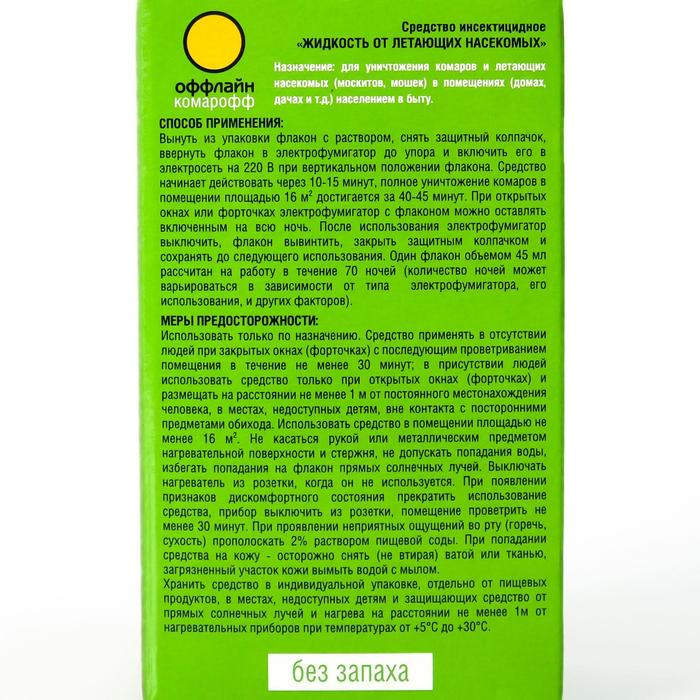 Назначение: для уничтожения комаров и других летающих кровососущих насекомых (москитов, мошек) в помещениях населением в быту, в том числе в присутствии детей.Способы применения: вынуть из упаковки флакон с раствором, снять защитный колпачок, ввернуть флакон в электрофумигатор до упора и включить его в электросеть на 220 В при вертикальном положении флакона. Полное уничтожение насекомых достигается менее чем через 1 час. При открытых окнах (форточках) электрофумигатор с флаконом можно оставлять включенным на всю ночь для уничтожения залетающих комаров и других насекомых. Электрофумигатор выключить, флакон вывинтить, закрыть защитным колпачком и сохранять до следующего использования.Меры предосторожности: использовать только по назначению. Средство применять в отсутствие людей при закрытых окнах (форточках) и размещать на расстоянии не менее 1 м от кровати ребенка и постоянного местонахождения человека. Использовать средство в помещении площадью не менее 13м2. Работающий электрофумигатор устанавливать в местах, недоступных детям, вне контакта с посторонними предметами обихода. Не касаться рукой или металлическим предметом нагревательной поверхности и стержня, не допускать попадания воды. Избегать попадания прямых солнечных лучей на флакон. Не накрывать нагреватель во время работы посторонними предметами. Выключать нагреватель из розетки, когда он не используется. При попадании средства на кожу - осторожно снять (не втирая) ватой или тканью. При попадании средства в глаза - тщательно и обильно промыть водой. При попадании в рот - прополоскать водой, выпить несколько стаканов воды с 10-20 измельченными таблетками активированного угля. При необходимости обратиться ко врачу. Хранить средство при t от 0°С до + 30°С в упаковке отдельно от пищевых продуктов, в местах недоступных детям и защищающих средство от прямых солнечных лучей и нагрева, на расстоянии не менее 1 м от нагревательных приборов.защищает бережно с натуральным экстрактом ромашки.Состав: натуральные пиретрины (0,025%), трансфлутрин (0,1%), праллетрин (0,5%), растворитель.Класс опасности: 4 (малоопасное вещество).Объём: 30 мл.
