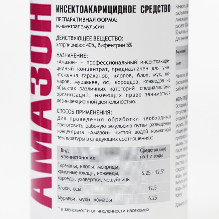 Средство инсектоакарицидное Амазон предназначено для уничтожения синантропных членистоногих (тараканов, постельных клопов, блох, кожеедов, рыжих домовых муравьев, домовых сверчков, чешуйниц, крысиных клещей).