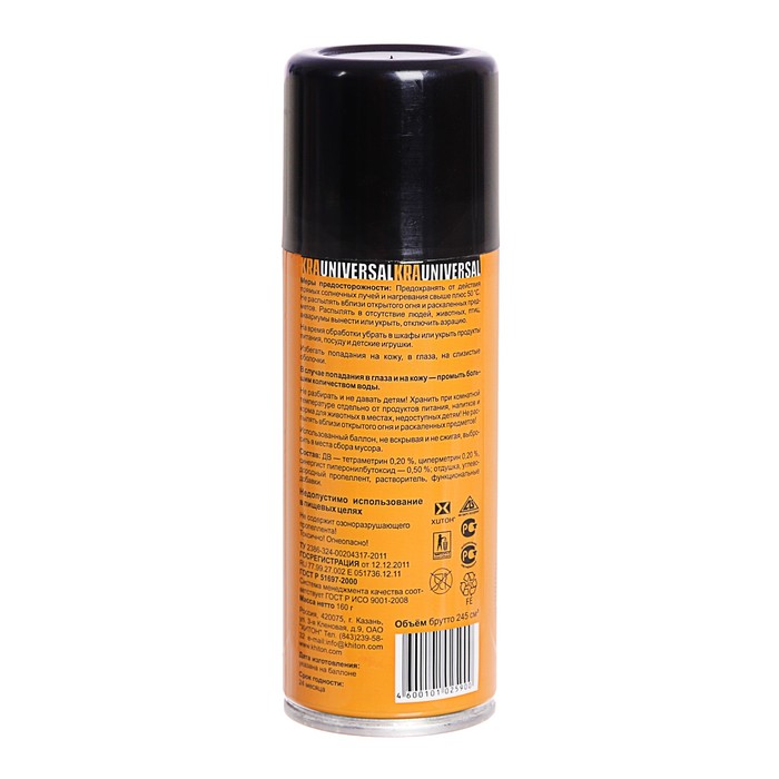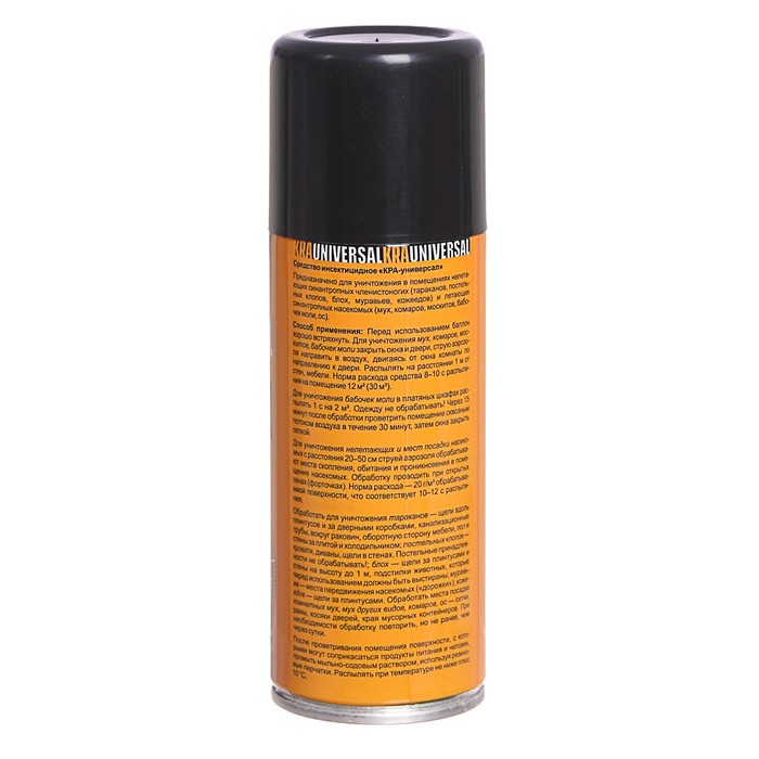 Средство инсектицидное «КРА-универсал». Предназначено для уничтожения в помещениях нелетающих синантропных членистоногих (тараканов, постельных клопов, блох, муравьев, кожеедов) и летающих синантропных насекомых (мух, комаров, москитов, бабочек моли, ос).