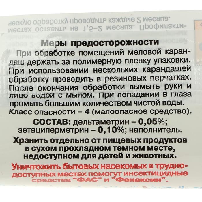 Средство предназначено для уничтожения тараканов, муравьев, клопов, блох и обработки мест посадки мух на объектах различных категорий как персоналом организаций, имеющих право заниматься дезинфекционной деятельностью, так и населению в быту.СОСТАВЗетациперметрин – 0,1%, дельтаметрин – 0,05%, гипс, мел.СПОСОБ ПРИМЕНЕНИЯОсвободите часть карандаша из упаковки и, держа за полиэтилен, нанесите несколько полос шириной 2-4см на поверхности, которые могут быть местами передвижения, скопления или обитания насекомых. Повторные обработки проводят по энтомологическим показаниям (при появлении насекомых). Норма расхода 1 карандаша (массой 20-30г) на 20-30м2 обрабатываемой поверхности.синатропные тараканы: мелком наносят полосы по поверхностям плинтусов, дверных коробок, вентиляционных решеток, по задним стенкам шкафов, столов, тумб, по трубам водопроводной и отопительной систем (особенно в местах их ввода и вывода). Обрабатывают поверхности в местах сбора мусора и нижнюю часть раковин. Обработку проводят одновременно во всех помещениях, где обнаружены тараканы а также смежных помещениях, чтобы предотвратить их заселение.рыжие домовые муравьи: мелком обрабатывают места их скопления и пути передвижения «дорожки».постельные клопы: средство наносят полосами на места обнаружения или возможного обитания насекомых таких, как картины, мебель и задняя поверхность ковров.блохи: мелком обрабатывают плинтусы и стены на высоту не более 1м, а также проводят полосы вдоль щелей в полу, между стенами и плинтусами.комнатные мухи: мелком проводят полосы по стыкам стекол и рам, по верхним частям дверей, шкафов, кухонной мебели и другим местам вероятной посадки.