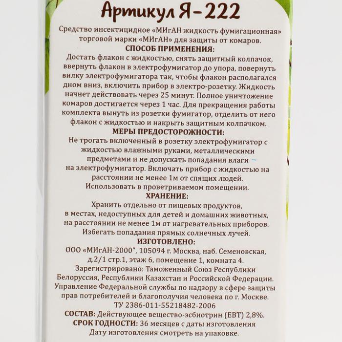 Флакон-жидкость ""Migan"" имеет объем 30 мл, что позволяет использовать его в течение длительного времени. Продукт удобен в применении - достаточно нанести несколько капель на одежду или постельное белье, и он обеспечит надежную защиту от комаров на протяжении всей ночи.