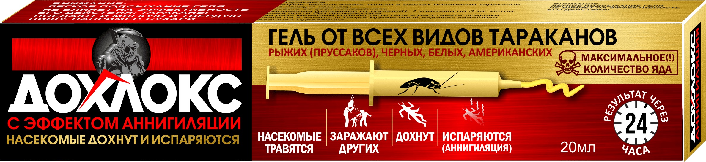 Дохлокс гель от тараканов– профессиональное инсектицидное средство в форме геля для уничтожения тараканов. Применяется на объектах различных категорий, в том числе жилых, лечебных, пищевых, детских персоналом организаций, имеющих право заниматься дезинфекционной деятельностью, а также населением в быту. Препарат содержит 0,05% фипронила – это мощный инсектицид, который вызывает тяжелые поражения нервной системы и пищевые добавки, привлекательные для насекомых. Насекомые, поедая приманку, погибают сами и становятся отравленной пищей для остальной популяции. Гибель тараканов наступает на 2-3 сутки.• Хранить препарат отдельно от лекарств, пищевых продуктов и кормов для животных в сухом, прохладном месте, недоступном для детей и животных.
