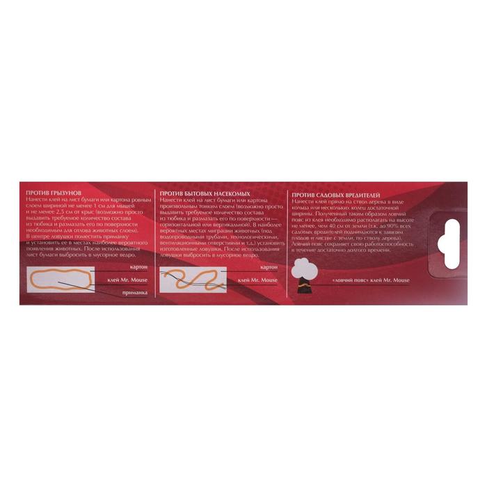 Клей Mr.Mouse является универсальным эффективным средством для механического отлова мелких грызунов (мышей, крыс, полёвок и т.д.), бытовых насекомых (тараканов, муравьёв и т.д.), садовых вредителей (гусениц, улиток и т.д.).