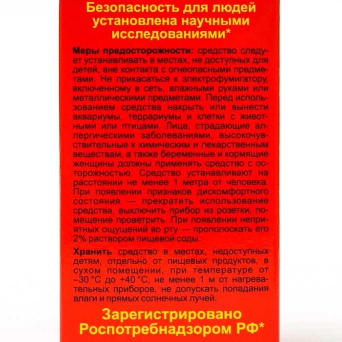 Меры предосторожности: средство следует устанавливать в местах, не доступных для детей, вне контакта с огнеопасными предметами. Не прикасаться к электрофумигатору, включенному в сеть, влажными руками или металлическими предметами. Перед использованием средства накрыть или вынести аквариумы, террариумы и клетки с животными или птицами. Лица, страдающие аллергическими заболеваниями, высокочувствительные к химическим и лекарственным веществам, а также беременные и кормящие женщины должны применять средство с осторожностью. Средство устанавливают на расстоянии не менее 1 метра от человека. При появлении признаков дискомфортного состояния — прекратить использование средства, выключить прибор из розетки, помещение проветрить. При появлении неприятных ощущений во рту — прополоскать его 2% раствором пищевой соды.