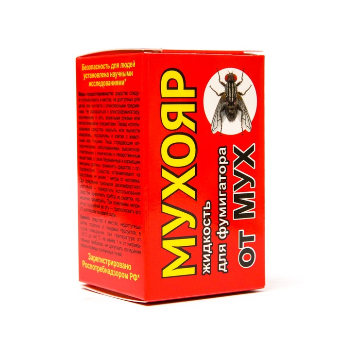 Средство инсектицидное электрофумигирующее «Мухояр» — жидкость от мух. Предназначен для уничтожения мух и других летающих насекомых (комары, москиты, бабочки, моли) в помещении. Разрешено к применению в присутствии людей. Безопасность для людей установлена научными исследованиями*.