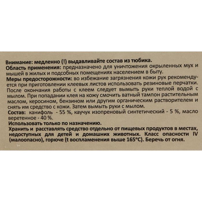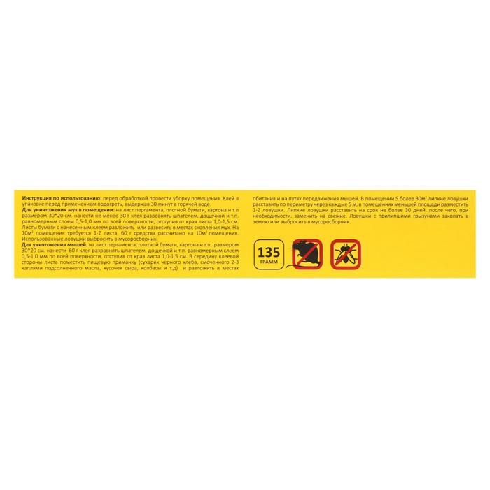 Для уничтожения мышей: на лист пергамента, плотной бумаги, картона и т.п. размером 30*20 см нанести 60 г клея равномерным слоем 0,5-1,0 мм по всей поверхности, отступив от края листа 1,0-1,5 см. В середину клеевой стороны листа поместить пищевую приманку (сухарик черного хлеба, смоченного 2-3 каплями подсолнечного масла, кусочек сыра, колбасы и т.д) и разложить в местах обитания и на путях передвижения мышей. Липкие ловушки расставить на срок не более 30 дней, после чего, при необходимости, заменить на свежие. Ловушки с прилипшими грызунами закопать в землю или выбросить в мусоросборник.