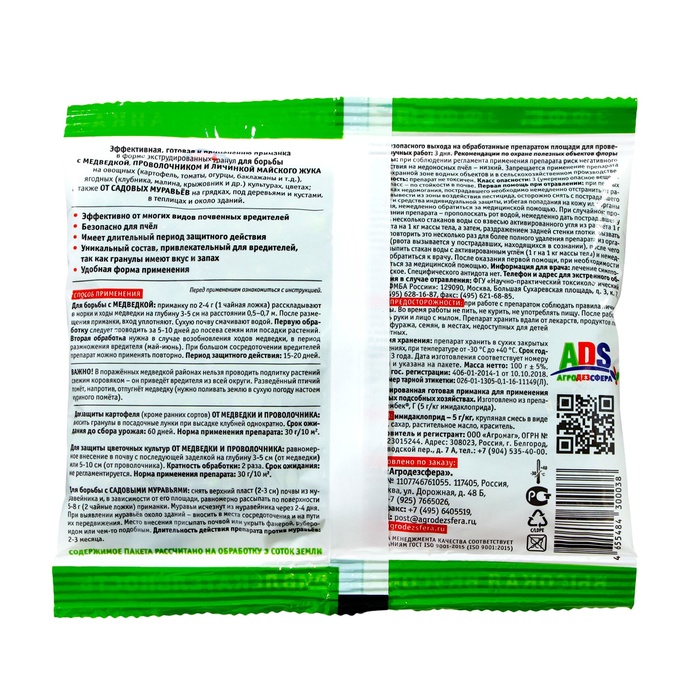 Эффективная, готовая к применению приманка в форме экструдированных гранул для борьбы с медведкой, проволочником и личинкой майского жука:на овощных (картофель, томаты, огурцы, баклажаны и т.д.) ягодных (клубника, малина, крыжовник и др.) культурах, цветахА также от садовых муравьёв: на грядкахпод деревьями и кустамив теплицах и около зданийСпособ применения:Для борьбы с медведкой: приманку по 2-4 г (1 чайная ложка) раскладывают в норки и ходы медведки на глубину 3-5 см на расстоянии 0,5-0,7 м. После размещения приманки, вход уплотняют. Сухую почву смачивают водой. Первую обработку следует проводить за 5-10 дней до посева семян или посадки растений. Вторая обработка нужна в случае возобновления ходов медведки, в период размножения вредителя (май-июнь). При большом сосредоточении вредителей препарат можно применять повторно.Период защитного действия: 15-20 дней. В поражённых медведкой районах нельзя проводить подпитку растений свежим коровяком-он приведёт вредителя из всей округи. Разведённый птичий помёт, (нужно поливать землю в сухую погоду настоем куриного помёта). СОСТАВ: имидаклоприд - 5г/кг, крупяная смесь в виде гранул, сахар, растительное масло, краситель. Подробнее: https://xn--80ado1abokv5d.xn--90ais/p179535203-napoval-200gr-medvedki.html)