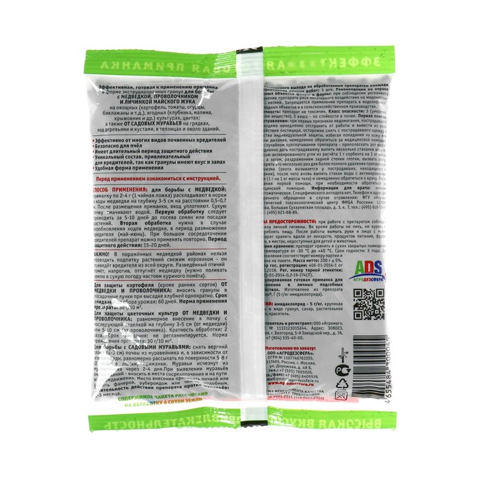 Эффективная, готовая к применению приманка в форме экструдированных гранул для борьбы с медведкой, проволочником и личинкой майского жука:на овощных (картофель, томаты, огурцы, баклажаны и т.д.) ягодных (клубника, малина, крыжовник и др.) культурах, цветахА также от садовых муравьёв: на грядкахпод деревьями и кустамив теплицах и около зданийСпособ применения:Для борьбы с медведкой: приманку по 2-4 г (1 чайная ложка) раскладывают в норки и ходы медведки на глубину 3-5 см на расстоянии 0,5-0,7 м. После размещения приманки, вход уплотняют. Сухую почву смачивают водой. Первую обработку следует проводить за 5-10 дней до посева семян или посадки растений. Вторая обработка нужна в случае возобновления ходов медведки, в период размножения вредителя (май-июнь). При большом сосредоточении вредителей препарат можно применять повторно.Период защитного действия: 15-20 дней. В поражённых медведкой районах нельзя проводить подпитку растений свежим коровяком-он приведёт вредителя из всей округи. Разведённый птичий помёт, (нужно поливать землю в сухую погоду настоем куриного помёта). СОСТАВ: имидаклоприд - 5г/кг, крупяная смесь в виде гранул, сахар, растительное масло, краситель. Подробнее: https://xn--80ado1abokv5d.xn--90ais/p179535203-napoval-200gr-medvedki.html)