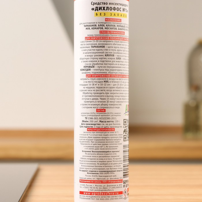 Средство инсектицидное Дихлофос №1 без запаха НАПОВАЛ - это инсектицидное средство для уничтожения в помещениях летающих и ползающих насекомых: тараканов, блох, клопов, муравьев, кожеедов, мух, комаров, москитов, бабочек моли, ос. Способ применения: Перед применением баллон хорошо встряхнуть. Для уничтожения ползающих насекомых с расстояния 15-20 см направить струю аэрозоля на поверхности- места скопления, возможного обитания или пути продвижения насекомых: тараканов- щели вдоль плинтусов и прилегающие к ним участки вдоль стен и пола, вдоль труб водопроводной и канализационной систем; клопов- места отставания обоев, обратную сторону картин, ковров; блох- стены на высоту до 1м, а так-же коврики и подстилки для животных с обратной стороны (после обработки постирать их в моющем растворе!); муравьев- пути передвижения и места скопления; кожеедов- плинтусы под радиаторами отопления, кроватями, шкафами, подоконники, обратную сторону шкафов и полок. Для уничтожения летающих насекомых: направить струю аэрозоля в воздух на места скопления насекомых и на места посадки мух в течение 3-5 сек. для помещений площадью 14-18 кв.м. и 10-12 сек. для помещений 25-30кв.м. Для уничтожения ос на чердаках, террасах и сараях обработать гнезда снаружи в ранние часы на рассвете, когда когда активность насекомых минимальна.Обработку проводить при закрытых окнах и дверях, через 15 минут помещение проветрить в течение 30 минут сквозным потоком воздуха и провести влажную уборку поверхностей, с которыми могут соприкасаться люди.Составциперметрин 0,2%, тетраметрин 0,15%, синергист, отдушка, углеводородный пропеллент, растворитель