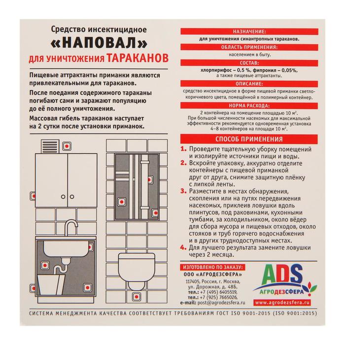 Описание:После поедания содержимого тараканы погибают сами и заражают популяцию до ее полного уничтожения. Массовая гибель тараканов наступает на 2 сутки после установки приманок. 2 контейнера на помещение площадью до 10 кв. м. При большой численности насекомых для максимальной эффективности рекомендуется одновременная установка 4-8 контейнеров на площади 10 кв. м.Состав: пищевой аттрактант 100%.Способ применения:1. Проведите тщательную обработку помещений и изолируйте источники воды пищи.2. Вскройте упаковку, аккуратно отделите контейнеры с пищевой приманкой друг от друга, снимите защитную пленку с липкой ленты.3. Разместите в местах обнаружения, скопления или на путях передвижения насекомых, приклеив ловушки вдоль плинтусов, под раковинами, кухонными тумбами, за холодильником, около ведер для сбора мусора и пищевых отходов. около стояков и труб горячего водоснабжения и в других труднодоступных местах.4. Для лучшего результата замените ловушки через 2 месяца.