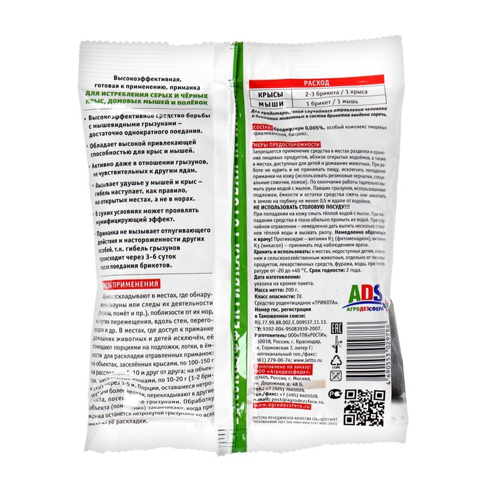Высокоэффективное средство для борьбы с мышевидными грызунами - достаточно однократного поедания. Обладает высокой привлекающей способностью для крыс и мышей.