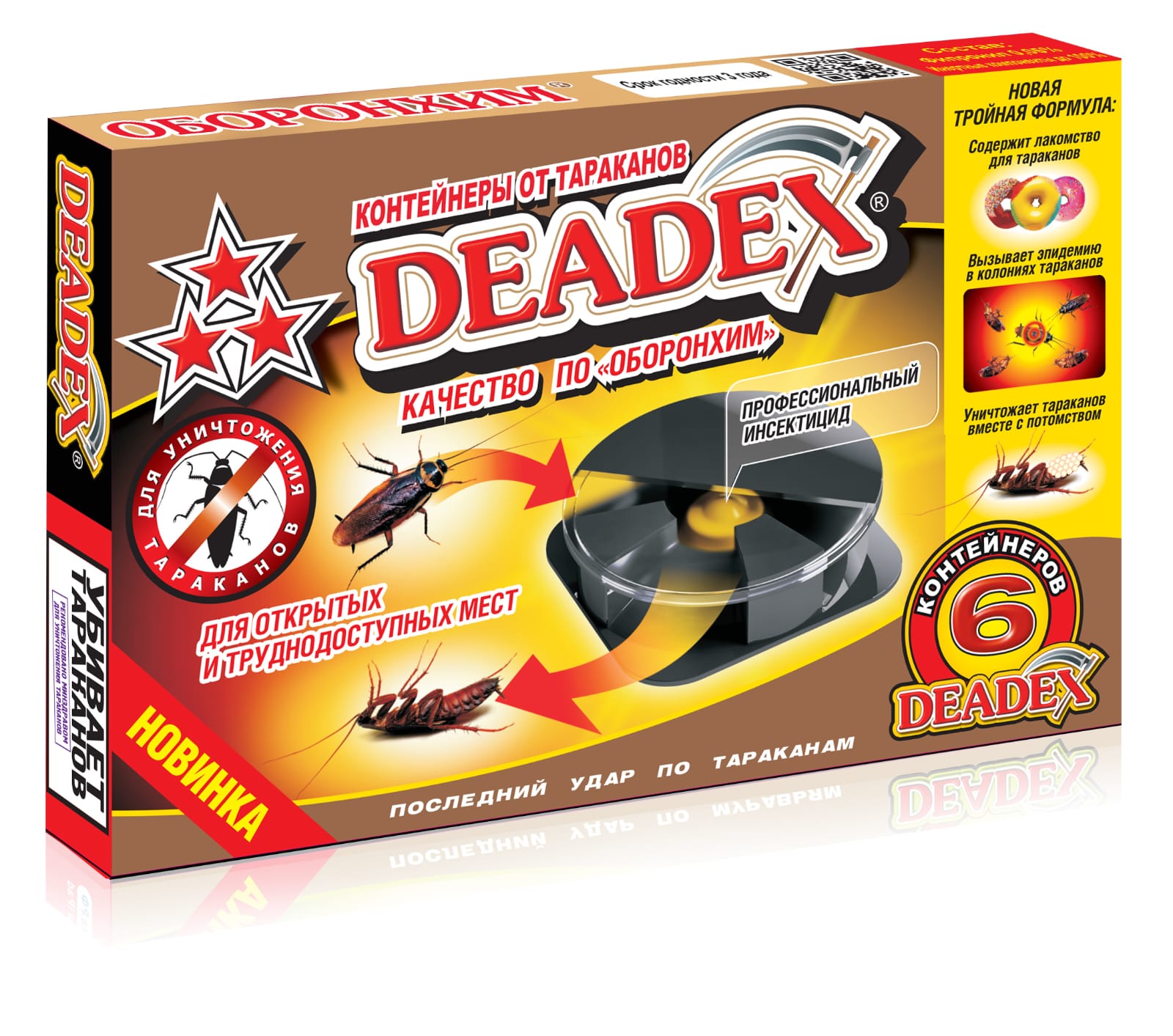 Ловушка приманка Deadex– средство, обеспечивающее защиту от тараканов и других насекомых. Это уникальная научная разработка для уничтожения тараканов как в открытых, так и в труднодоступных местах. Может использоваться в жилых помещениях, детсадах, яслях, предприятиях общепита, объектах ветеринарии и содержания животных.Представляет собой небольшой пластиковый контейнер с приманкой внутри, недоступной для детей и животных. В упаковке 6 контейнеров из высокопрочного пластика. Содержит лакомство, инсектицид фипронил 0,05%, который вызывает эпидемию в колониях тараканов, уничтожая их вместе с потомством.Принцип действия:1. Таракан заползает в контейнер с приманкой.2. Таракан выползает из контейнера съев отравленную приманку.3. Заражённый таракан становиться носителем инсектицида и вызывает эпидемию, убивающую колонию тараканов.