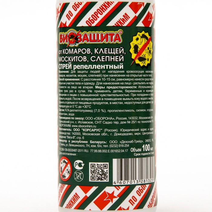 Спрей репеллентный "Биозащита" разработан специально для борьбы с насекомыми. Его состав включает только натуральные ингредиенты, которые не наносят вреда человеку и окружающей среде. Благодаря этому, "Биозащита" может быть использована даже в помещениях, где находятся дети и животные.Одним из самых важных преимуществ спрея "Биозащита" является его эффективность.Спрей образует на коже защитный слой, который отпугивает насекомых и предотвращает их укусы. Благодаря этому, вы можете наслаждаться отдыхом на природе или просто проводить время на свежем воздухе, не беспокоясь о нашествии комаров и других насекомых.Однако, как и любое другое средство для защиты от насекомых, "Биозащита" требует соблюдения определенных мер предосторожности.• Не рекомендуется использовать ее на поврежденной коже или близко к глазам.• Также не стоит применять "Биозащиту" слишком часто или на больших участках кожи.Срок годности: 5 лет от даты изготовления.Способ применения: с расстояния 10-15 см равномерно нанести средство на открытые участки тела и одежду.