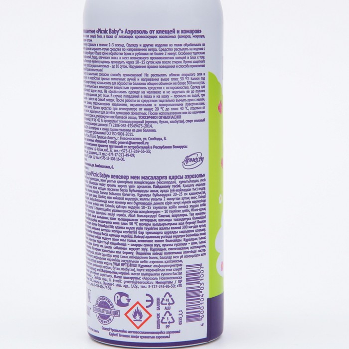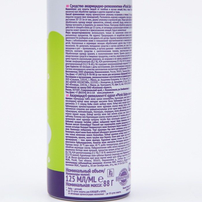 Описание: средство от клещей и комаров защитит вас не только от кровососущих насекомых (комаров, мокрецов, москитов, мошек, слепней, блох), но и от таежных и лесных клещей. Сочетание активного действующего вещества и масла андиробы — тропического растения из Амазонии, обеспечивает надёжную защиту до 8 часов в местах с большим скоплением насекомых. Аэрозоль Picnic Baby от клещей и комаров - эффективное средство защиты, которое необходимо во время походов и поездок на природу.Способ применения: наносить на одежду; перед применением упаковку встряхивать в течение 2 - 3 секунд, одежду и другие изделия из ткани обрабатывать на открытом воздухе (вне помещений), располагать изделия и направлять струю средства по направлению ветра, средство распылять на изделия с расстояния 20-25 см от них, держа упаковку в вытянутой руке, общее время обработки брюк и рубашки не более 2 минут, особенно тщательно обрабатывать одежду вокруг щиколоток, голеней, коленей, бедер, плечевого пояса и мест возможного проникновения клещей и блох к телу, одежду просушить и надевать на нижнее белье.Состав: альфациперметрин (0,2%), N,N-диэтилтолуамид (7,5%), не менее 30%: пропеллент углеводородный (пропан, бутан, изобутан), спирт этиловый денатурированный (53,1% об.).Срок годности: 5 лет от даты изготовления.