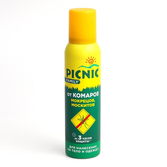 Аэрозоль от комаров, мокрецов и москитов «Picnic Family» подарит вам ощущение безмятежности и покоя, защищая от насекомых прекрасным летним днем.Средство содержит экстракт алоэ и разработано для защиты взрослых и детей (с 5 лет) от нападения кровососущих насекомых (комаров, мокрецов, москитов, мошек, слепней, блох).Его можно наносить как на открытые части тела, так и на одежду, занавеси, сетки и другие изделия из ткани.Время защитного действия от насекомых при нанесении на кожу — до 3 часов, при нанесении на одежду и другие изделия из ткани — до 5 суток.Преимущества продукта: Активная и современная действующая формула.Универсальная защита от всех летающих (комаров, мокрецов, москитов). Подходит для всех членов семьи, для взрослых и детей (с 5 лет).Удобный формат – 150мл. Состав: > 30 % алифатические углеводороды, спирт этиловый денатурированный – 37,1 % об., N,N-диэтил-м-толуамид (Дэта) – 4,5 %, пропиленгликоль, парфюмерная композиция, экстракт ромашки, экстракт алоэ, ПВП/ВА сополимер.