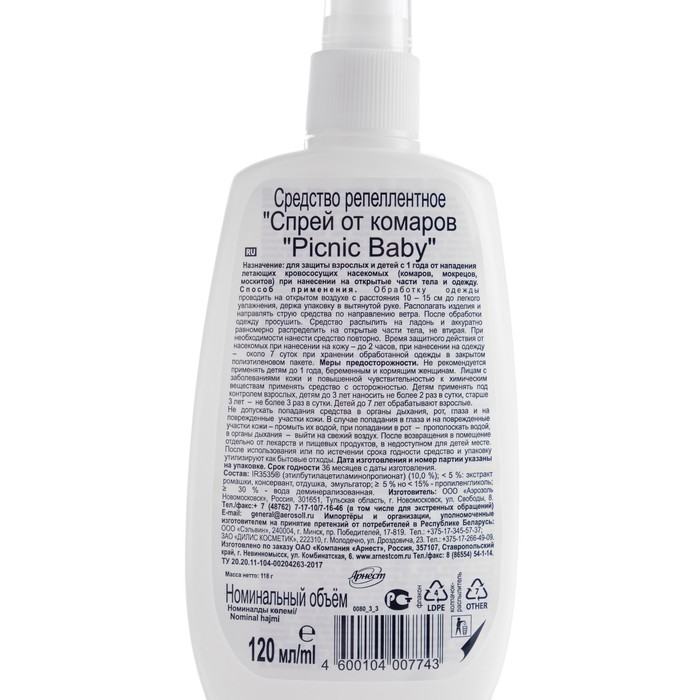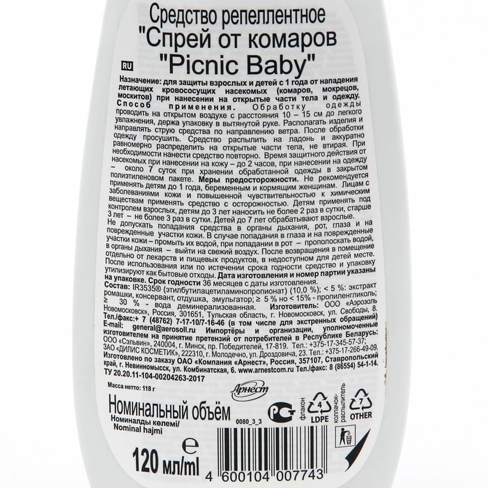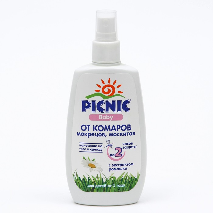Составвода, этил бутилацетил-аминопропионат (IR3535) - 10%, пропиленгликоль, лаурет-23, экстракт ромашки, парфюмерная композиция, гексаметилентетрамин.ХарактеристикиСпрей от комаров Picnic Baby предназначен для деликатной защиты нежной кожи детей от нападения кровососущих насекомых (комаров, москитов, мокрецов). Специальная формула спрея на основе безопасных репеллентов содержит экстракт ромашки, оказывающий противовоспалительное действие на кожу. При нанесении на открытые участки кожи не вызывает раздражения.ИнструкцияСредство необходимо наносить на открытые участки кожи и на одежду. Время защитного действия от насекомых, при нанесении на кожу — до 2-х часов. Время защитного действия на одежде — около 1 недели (при хранении одежды в полиэтиленовом пакете).