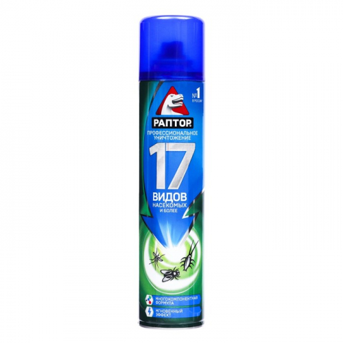 Универсальный аэрозоль Раптор – эффективное средство защиты от семнадцати видов ползающих и летающих насекомых. Благодаря трем сильным инсектицидам в составе оно не дает возможности для вредителей адаптироваться и выработать иммунитет, оставаясь одинаково действенным от обработки к обработке. Клопы, блохи, тараканы, мухи, муравьи, осы и пауки надолго покинут ваш дом, если обработать его укромные места спреем Раптор. Мощная струя и широкий охват распылителя позволяет проникнуть препарату в самые труднодоступные места. Средство наносится легко и действует мгновенно. Оно не токсично и не оставляет следов и пятен на поверхностях. Наилучших результатов от применения аэрозоля можно добиться, распыляя средство во всех помещениях, где обнаружены насекомые, одновременно. Повторную обработку для закрепления эффекта следует провести через месяц.Состав Средство отличается уникальным составом, в котором присутствуют три сильнодействующих инсектицида: тетраметрин – 0,20%; циперметрин – 0,15%, имипротрин – 0,05%. Вспомогательными веществами являются: растворитель углеводородный; пропеллент углеводородный (пропан, бутан, изобутан, 60 %), ароматическая отдушка. Спрей не содержит хладонов и озоноразрушающих компонентов.Способ применения Перед применением следует снять защитный пластиковый колпачок, хорошо встряхнуть баллон. Удерживая его вертикально на вытянутой руке, распылите аэрозоль с расстояния в 20 см на места передвижения, скопления или потенциального обитания насекомых. Уделите особое внимание таким зонам: щели в стенах и полу, зазоры за плинтусами и дверными коробками, под подоконниками, задние поверхности мебели, картин, ковры и подстилки для животных, санузлы, мусоропроводы, вентиляционные отверстия, вдоль трубопровода и канализационных труб. Распыляйте в течение 15 секунд. Через 15 минут после обработки помещения, его следует проветрить не менее 30 минут.