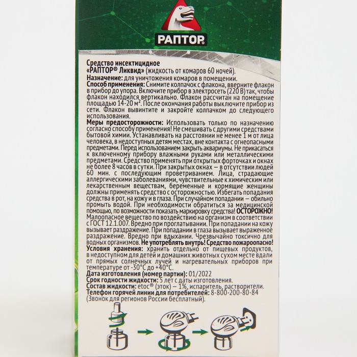 Дополнительный флакон-жидкость от комаров «Раптор», без запаха, 60 ночей