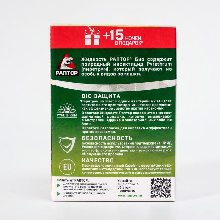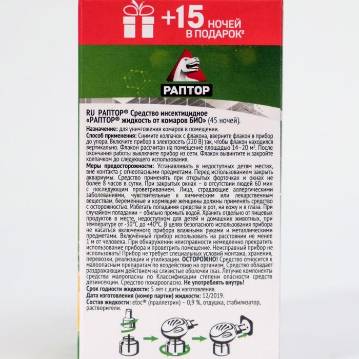 Принцип действия жидкости Раптор очень прост: при нагревании стержня флакончика от керамического нагревательного элемента прибора начинается медленное испарение действующего вещества эток. Испаряясь, оно постепенно заполняет пространство, оказывая свое воздействие на насекомых.Etoc (эток) – высокоэффективное вещество, формула которого была разработана в Японии. На насекомых эток действует, как сильное нервнопаралитическое средство. Для людей и домашних животных оно совершенно безвредно (из-за значительной разницы в массе тела человека/животного и насекомого).Без запаха. Состав: эток, испаритель, растворитель