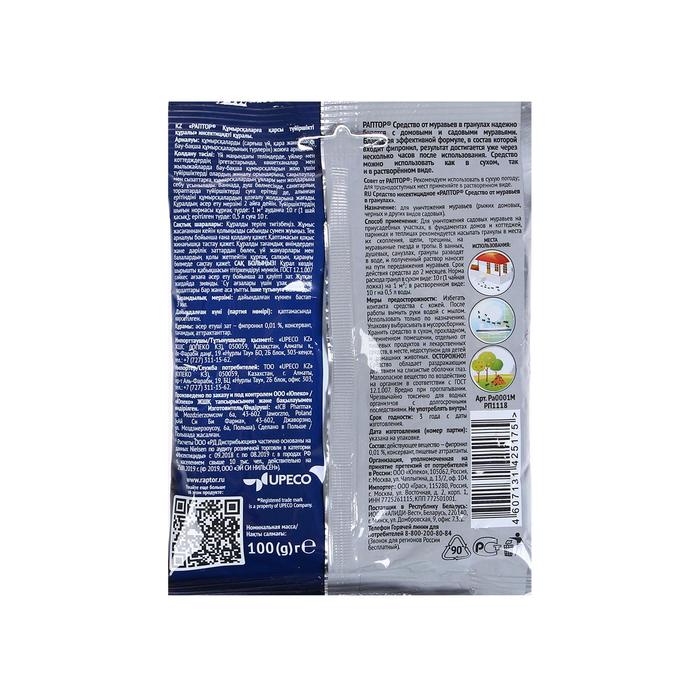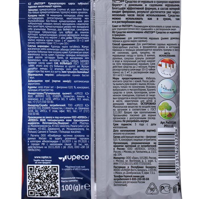 Средство от муравьёв РАПТОР в гранулах - настоящее спасение от всех видов домашних и садовых муравьёв. Проявите наблюдательность - проследите маршрут перемещения этих мелких вредителей. Он приведёт вас к местам их "гнездования”.Гранулы РАПТОР можно рассыпать по пути следования и в очагах скопления муравьёв (из расчёта 10 г на 1 кв. м) или использовать в виде раствора (10 г на 0,5 л воды). Приманка-аттрактант, входящая в состав гранул, привлекает насекомых, а действующее вещество фипронил - воздействует на них снаружи и изнутри, полностью парализуя через 8 часов после первого контакта.Максимальный эффект наступит уже через две недели (!) после обработки территории. И в течение ближайших двух месяцев муравьи вас не побеспокоят. При повторном появлении особей обработку необходимо повторить. Доверьтесь европейскому качеству РАПТОР! Раптор-эффект: насекомых нет! Состав:фипронил, консервант, пищевые аттрактанты
