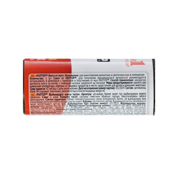 Специальная ловушка для мух представляет собой картонную гильзу, внутри которой свернутая в спираль длинная лента со специальным клеящим составом высокого качества. Пролетающие мимо насекомые задевают ленту и прилипают к ней, не имея ни единого шанса освободиться.Липкая лента для ловли мух Раптор длиной 85 см справляется со своей задачей в течение 2 месяцев, однако в случае заполнения насекомыми, должна заменяться раньше.Функцию действующего вещества в данном случае выполняет высококачественный клеевой состав, который надежно удерживает мух на поверхности ленты. Клей не содержит отравляющих или токсических компонентов, безопасен для человека и окружающей среды. Поэтому ленту против мух можно использовать даже аллергикам.Инструкция: Возьмите одной рукой картонную гильзу, а другой потяните за петлю, совершая вращательные движения. Вытащите ленту до конца, но не отрывайте ее от гильзы. Закрепите ленту на потолке. Используйте ленту в течение 2 месяцев, после чего замените ее новой.
