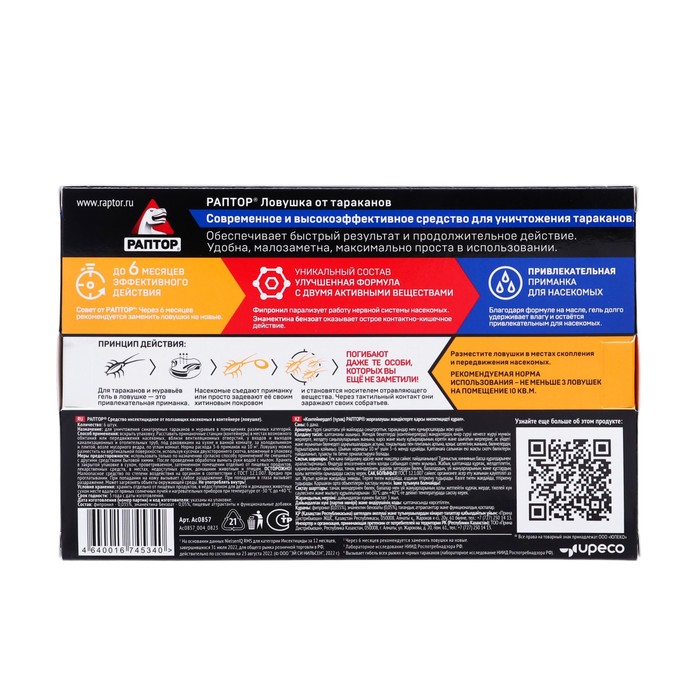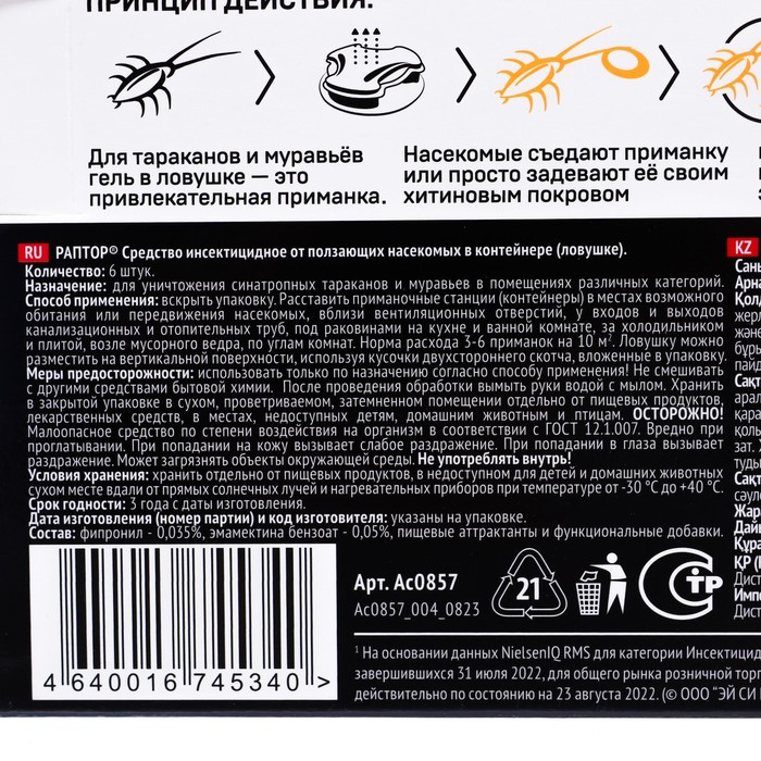 Для тараканов и муравьев гель в ловушке - это привлекательная приманкаНасекомые съедают приманку или просто задевают ее своим хитиновым покровом и становятся носителем отравляющего вещества. Через тактильный контакт они заражают своих собратьев.FIPRONIL (ФИПРОНИЛ) – контактный и кишечный инсектицид широкого спектра действия, обладает умеренными системными свойствами и хорошей остаточной активностью. Высокая кишечная активность и сильное контактное действие позволяют применять фипронил в составе инсектицидных средств в различных средствах по эффективной защите от насекомых.EMMAMECTIN BENZOATE (ЭММАМЕКТИН БЕНЗОНАТ) - инсектицид кишечно-контактного действия. Вещество воздействует на центральную нервную систему насекомого. Это приводит к расслаблению мышц (они не могут сокращаться), через 1–4 часа особи перестают питаться, а в течении 1-4 суток насекомое погибает.Инструкция: Перед использованием ловушки для тараканов проведите тщательную уборку помещения, в том числе в труднодоступных местах. Аккуратно разместите ловушки в местах обитания и передвижения тараканов. Вам понадобятся 2-3 ловушки на помещение площадью 10 м² (при невысокой численности насекомых). Важно! Не используйте аэрозоли от насекомых одновременно с ловушками, т.к. их запах отпугивает тараканов от ловушек. Для более эффективной защиты от тараканов рекомендуется заменить ловушки на новые через 2 месяца использования.