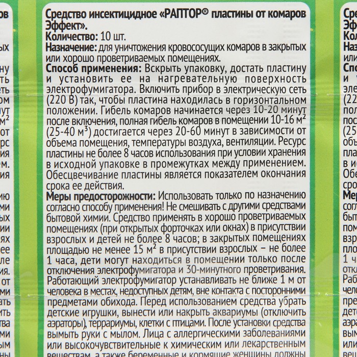 Пластины «Раптор» обеспечивают 100% уничтожение комаров в помещении. Для использования достаточно вставить пластину в гнездо фумигатора. При нагревании средство начинает постепенно испаряться, что обеспечивает равномерность распространения действующего вещества в воздух. Препарат уничтожает как уже находящихся в помещении особей, так и вновь залетающих насекомых. Пластина начинает действовать всего через 10-15 минут после включения прибора.В состав входит высокоэффективное японское действующее вещество. etoc® (эток) – 9 мг/пластину, синергист – 30 мг/пластину, краситель, отдушка, стабилизатор, растворительДля использования достаточно вставить пластину в гнездо фумигатора. При нагревании средство начинает постепенно испаряться, что обеспечивает равномерность распространения действующего вещества в воздух. Препарат уничтожает как уже находящихся в помещении особей, так и вновь залетающих насекомых.