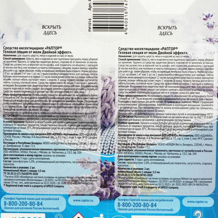 Секция от моли Раптор, гелевая, двойной эффект, с ароматом лаванды, 2 шт.